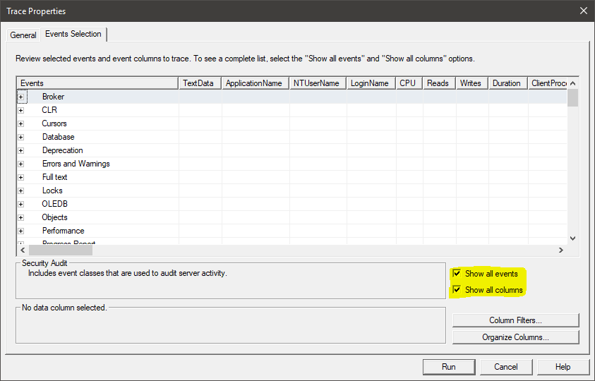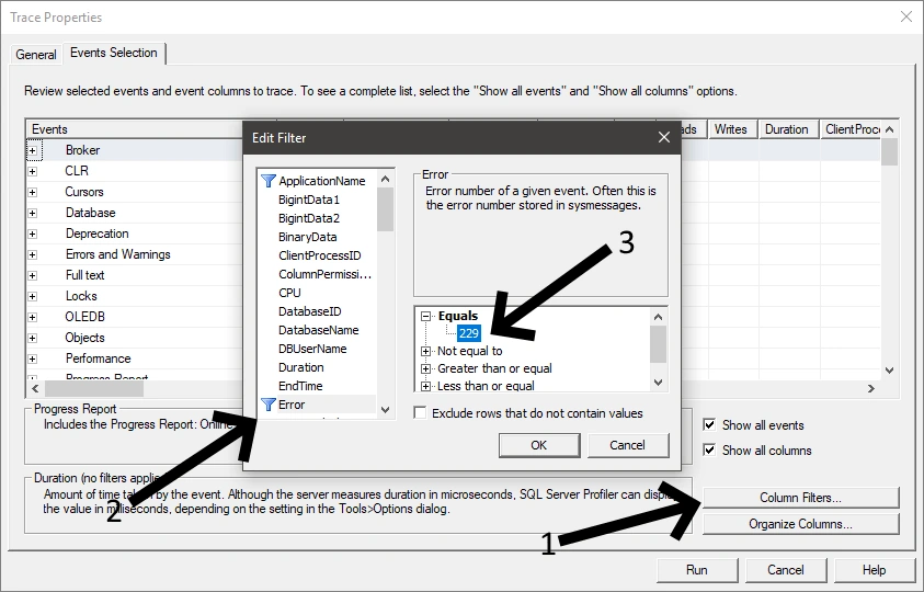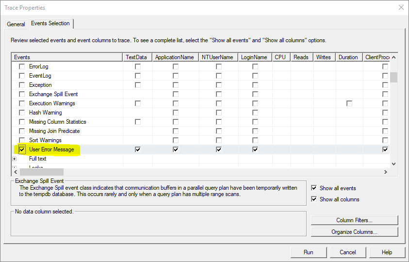 - When the ‘trace properties’ window opens, switch to the ‘Events Selection’ tab and tick the “show all events” and “show all columns” boxes. This will allow us to filter our results to the error we care about in the next step.