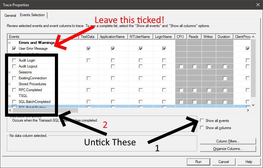 - Now that you have filtered the results down to the error message in question; you will want to remove all the default information the trace provides, if only to clean up the results! Untick the two boxes we ticked in step 2 (the show all boxes); and then untick all the other checkboxes in the events selection.